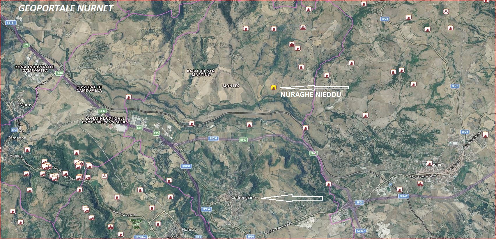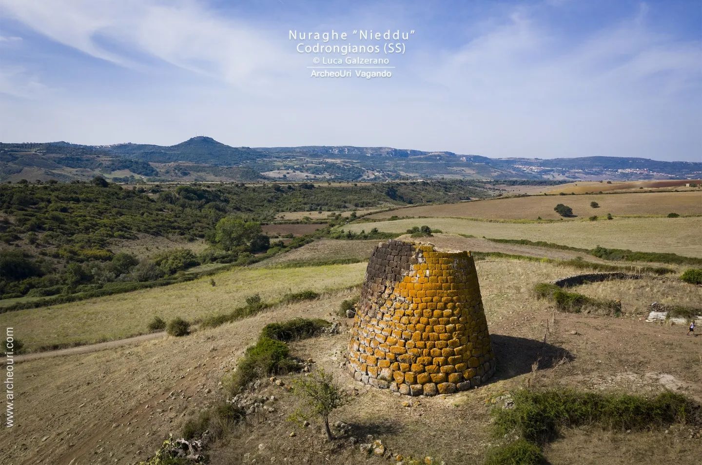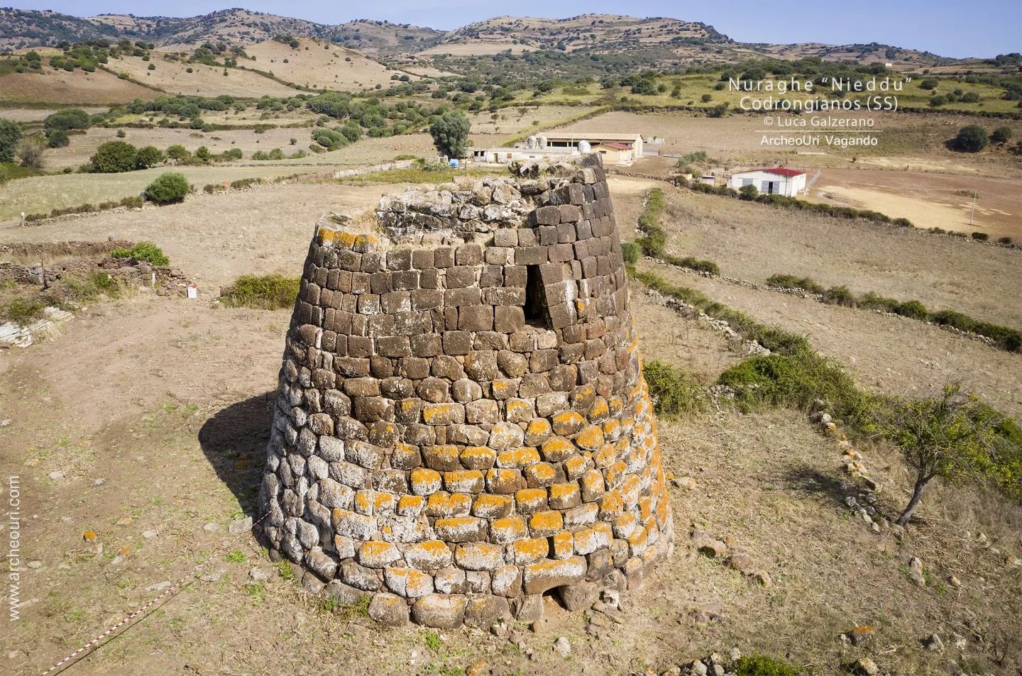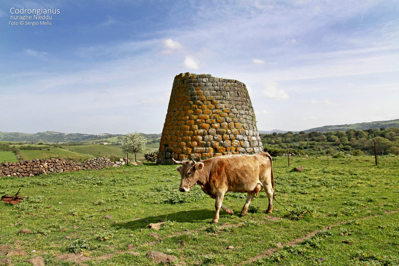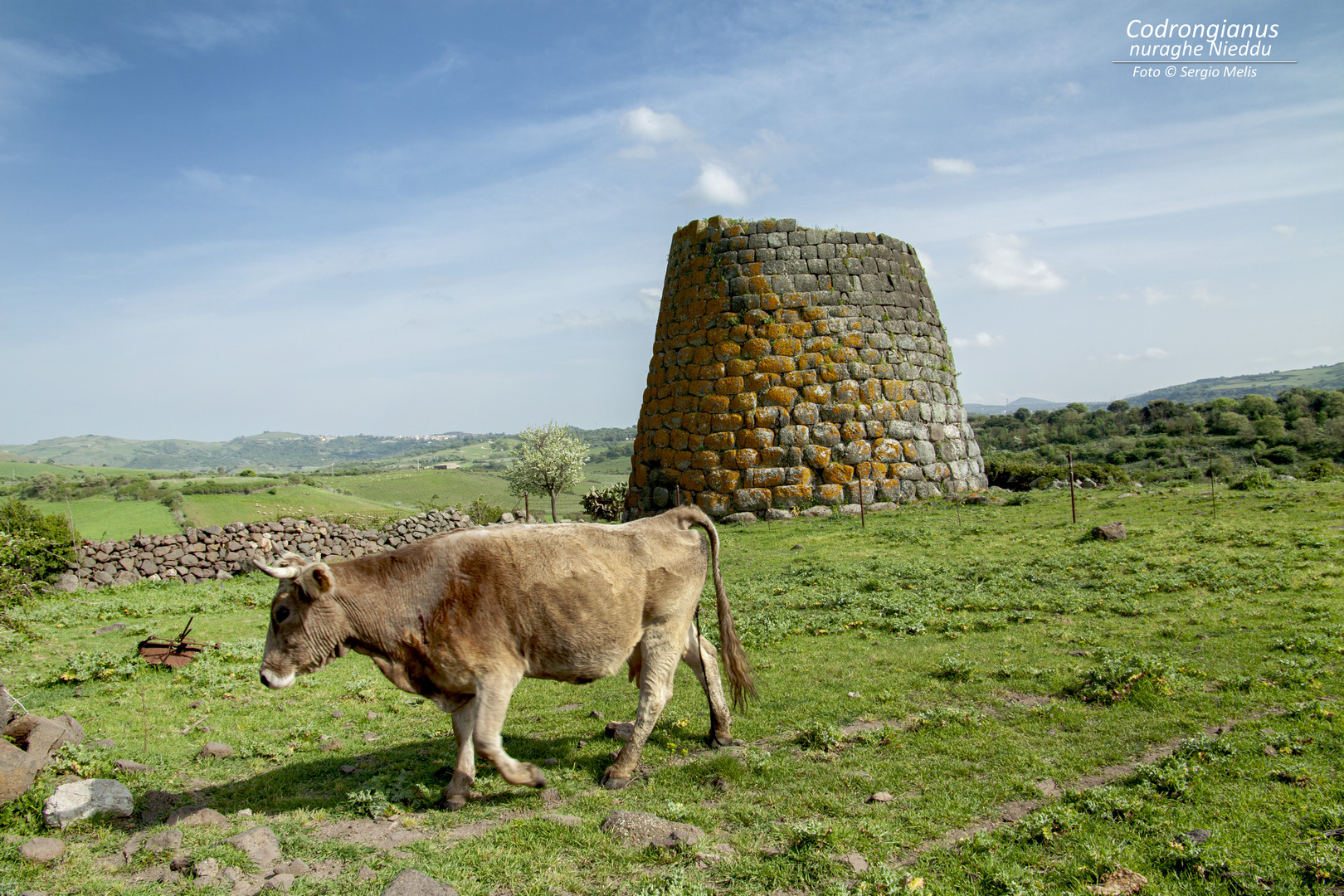 Il paese di Codrongianos “deve in gran parte la sua fama alla scenografica basilica della Santissima Trinità di Saccargia. Codrongianos sorge sui colli del Logudoro, a trecento metri d’altitudine, popolato da circa 1300 abitanti. I resti di circa 60 nuraghi testimoniano che il territorio fu intensamente popolato già nel II millennio a.C., nell’età del Bronzo. Il nuraghe Nieddu è quello meglio conservato: un’unica torre, alta undici metri, con copertura a tholos (falsa cupola), posta su una piccola altura e costruita con blocchi di basalto scuro (nieddu) che, assieme ai licheni gialli, ne caratterizzano il colore”.