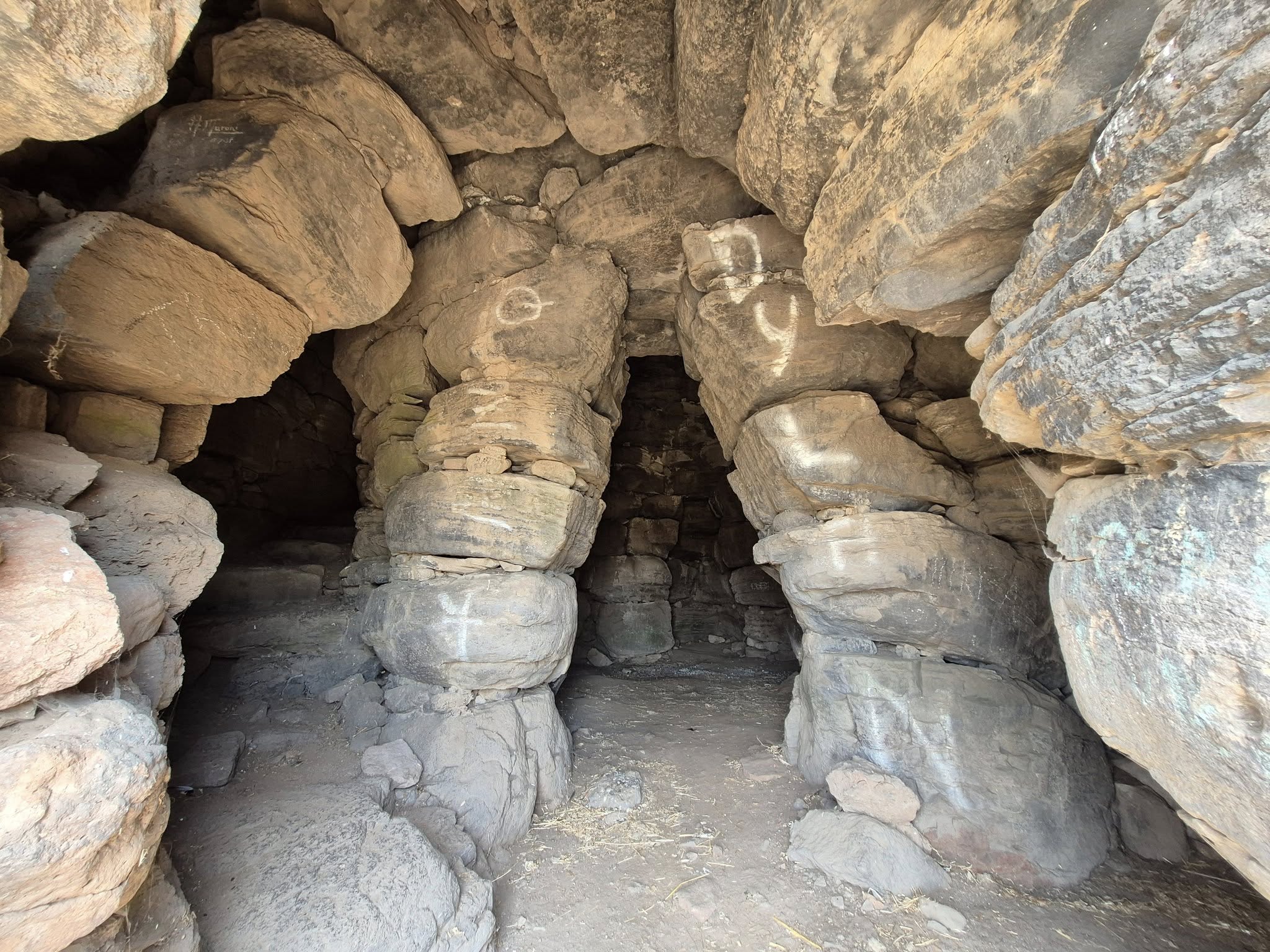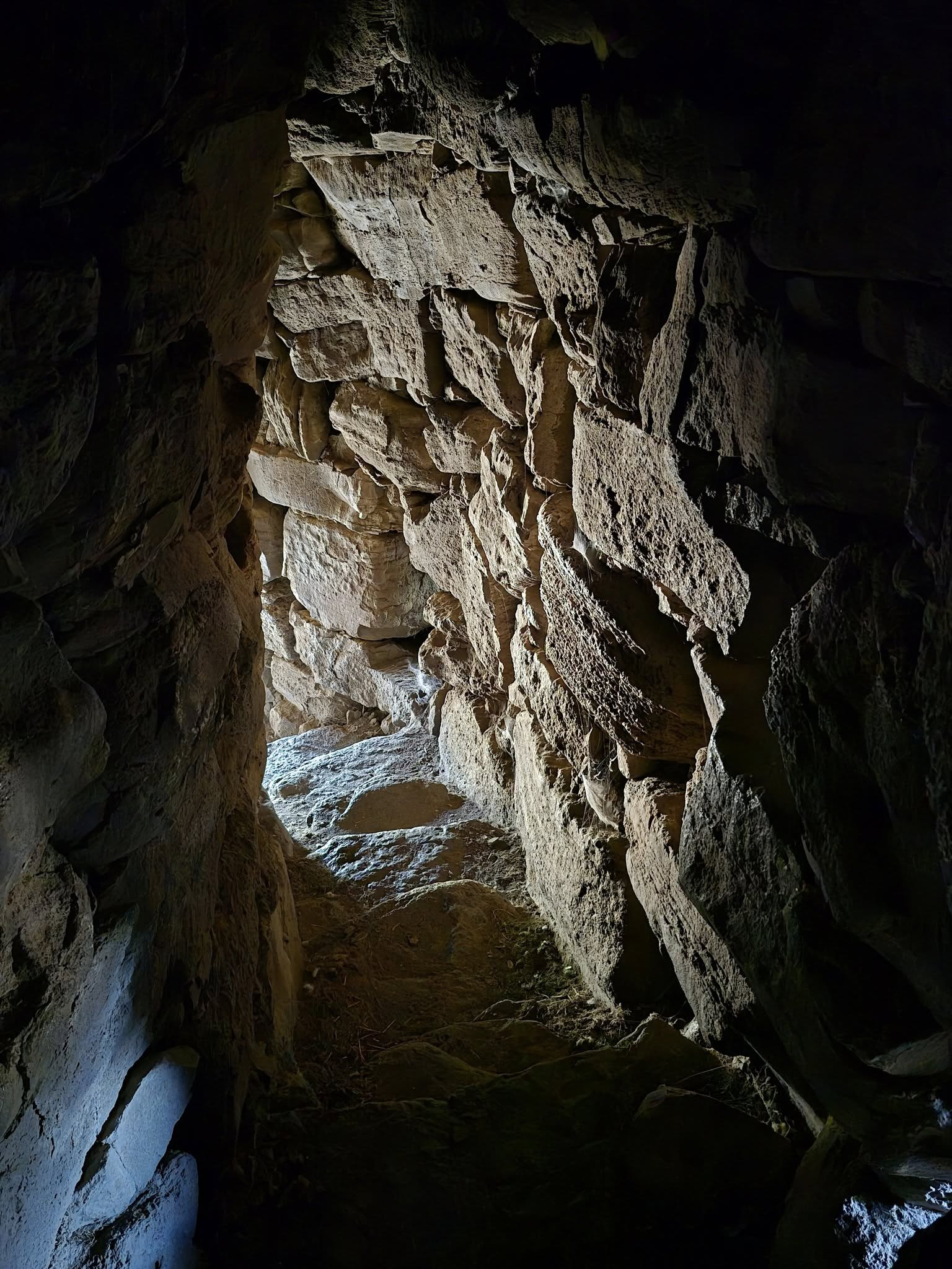 En la mampostería exterior se aprecian varias tomas de luz, triangulares o cuadrangulares, dispuestas casi en espiral.