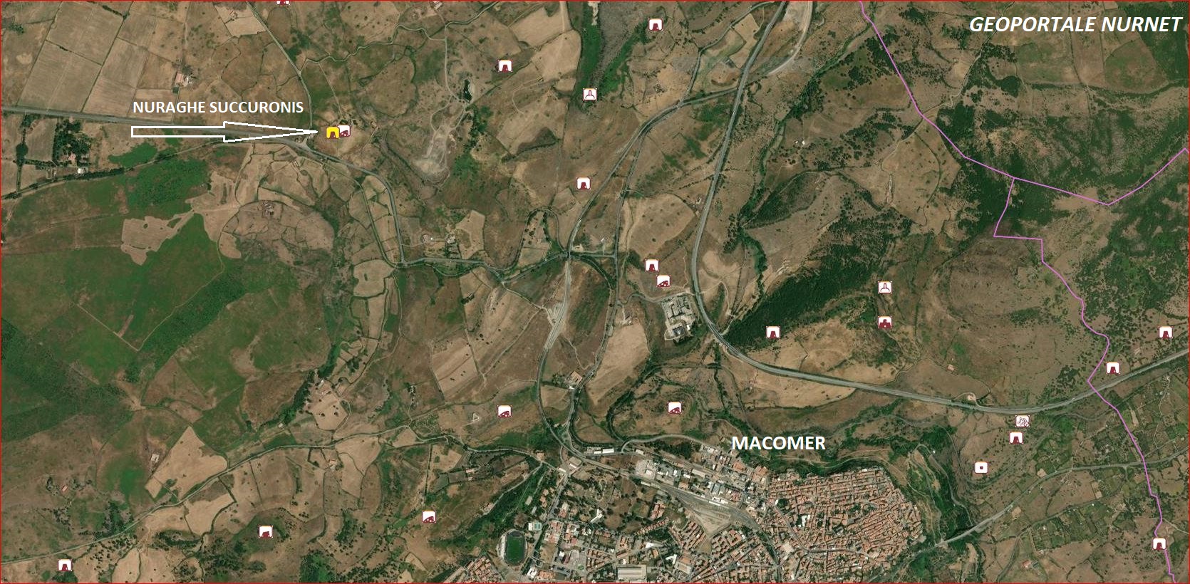 El Succoronis Nuraghe está construido sobre un afloramiento de traquita (roca volcánica) a lo largo de la carretera que va de Macomer a Sindia. Es una hermosa torre única que conserva la cúpula. Se accede a la cámara a través de un pasillo con escalera y hornacina, y en el interior hay tres grandes hornacinas, casi como pequeñas habitaciones.