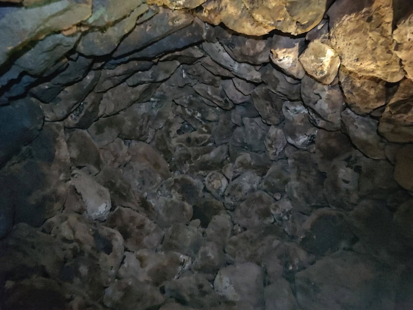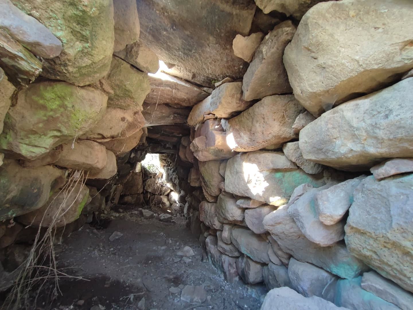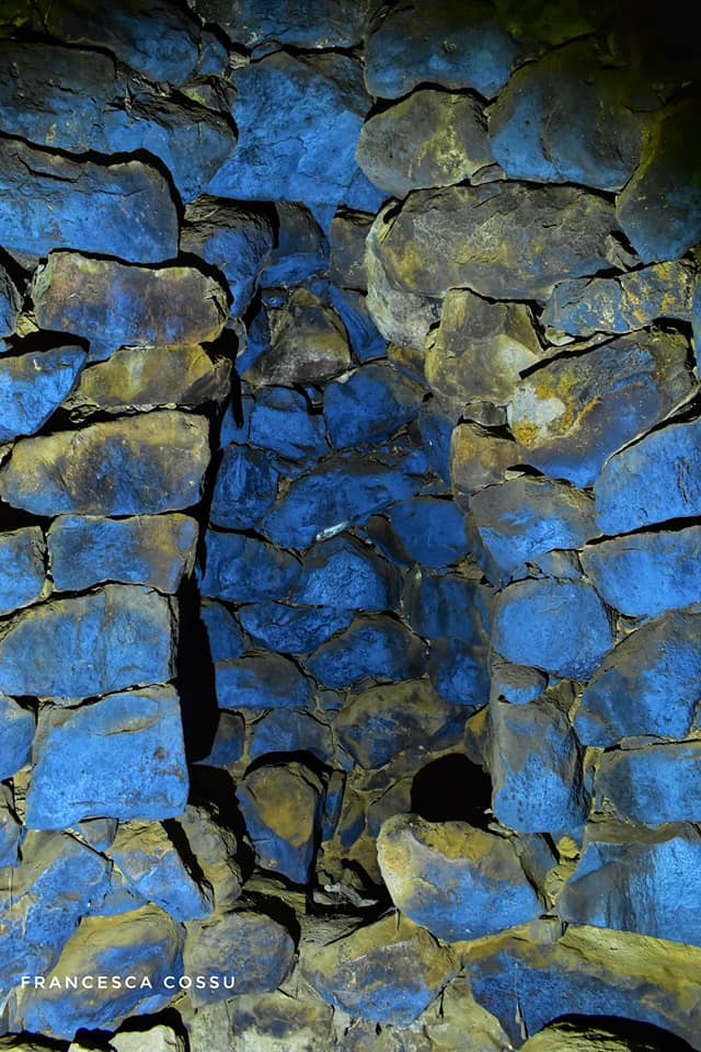 Delle cinque torri, quella esposta a est si mantiene in buone condizioni, così come parte di quella orientata verso sud-ovest. Nella torre est osserverai un vano circolare, con copertura a tholos intatta, dal quale parte un corridoio a sezione ogivale che sfocia nel cortile. In una parete noterai una nicchia, leggermente sopraelevata rispetto al pavimento. Nel vano, ecco il fenomeno che caratterizza il Genna ‘e Corte: la colorazione tendente all’azzurro in alcuni punti delle pareti. Si ipotizza che tale cromatismo sia dovuto alla presenza di licheni sulla superficie interna dei blocchi.
