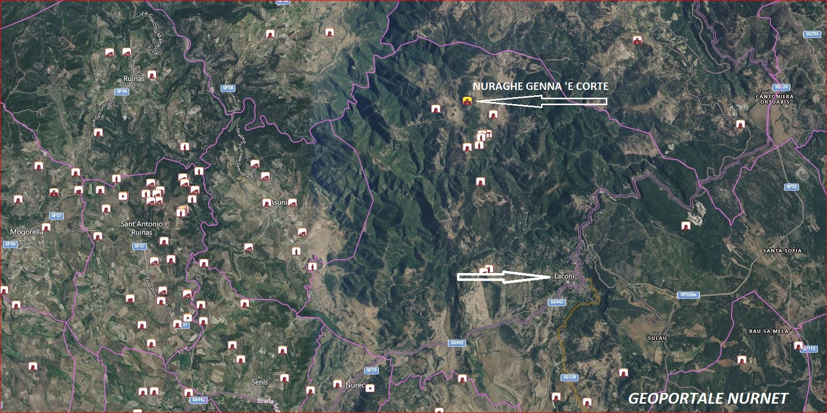 L’area in cui svetta ha riportato alla luce alcuni dei più importanti reperti preistorici dell’Isola, mentre la sua peculiarità non è stata ancora del tutto chiarita: le pietre al suo interno si tingono d’azzurro.Il nuraghe Genna ‘e Corte si erge su un rilievo in località Stunnu, dieci chilometri a nord di Laconi. È una struttura complessa, formata da una torre centrale (mastio) e da cinque torri secondarie, collegate da cortine murarie ad andamento rettilineo, la cui altezza massima residua è di sette metri. Il materiale di costruzione è la trachite, ricavata in blocchi di medie dimensioni disposti a filari orizzontali. Il mastio si conserva per un’altezza di circa dodici metri, con un diametro di poco superiore. La camera principale è ingombra di pietre dovute ai crolli, ma è tuttavia possibile ‘leggere’ la linea delle pareti del corridoio al secondo livello.