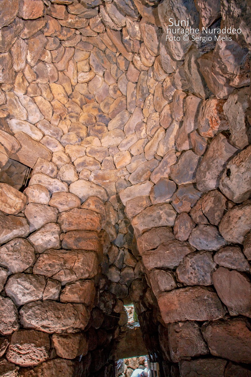 Il nuraghe Nuraddeo di Suni, “alto 14 m, è conservato in maniera eccellente. Oltre al piano inferiore, con una scala si accede a quello superiore – eccezionalmente ancora coperto dalla cupola – e, salendo ancora, si arriva alla terrazza superiore.