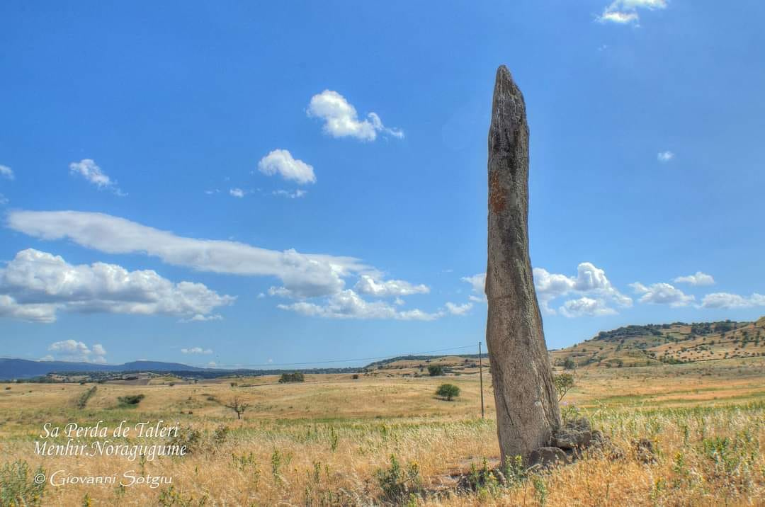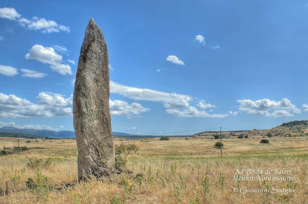 Il ‘simbolo’ di Noragugume, però, non è un nuraghe, ma una pedra fitta, ovvero un menhir: uno dei più noti dell’Isola, si chiama Sa Perda ‘e Taleri. Conosciuto anche come menhir di Giorgia Rajosa, è un monolito in basalto, completamente isolato tra le campagne. È alto circa quattro metri e mezzo, ben conservato, con evidenza di un’accurata lavorazione con la tecnica della martellina. Ai suoi piedi si trovano frammenti di macine e pestelli, oltre a numerose schegge di ossidiana.