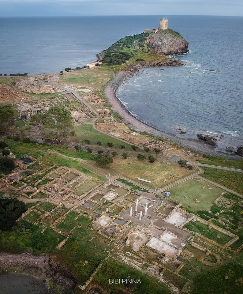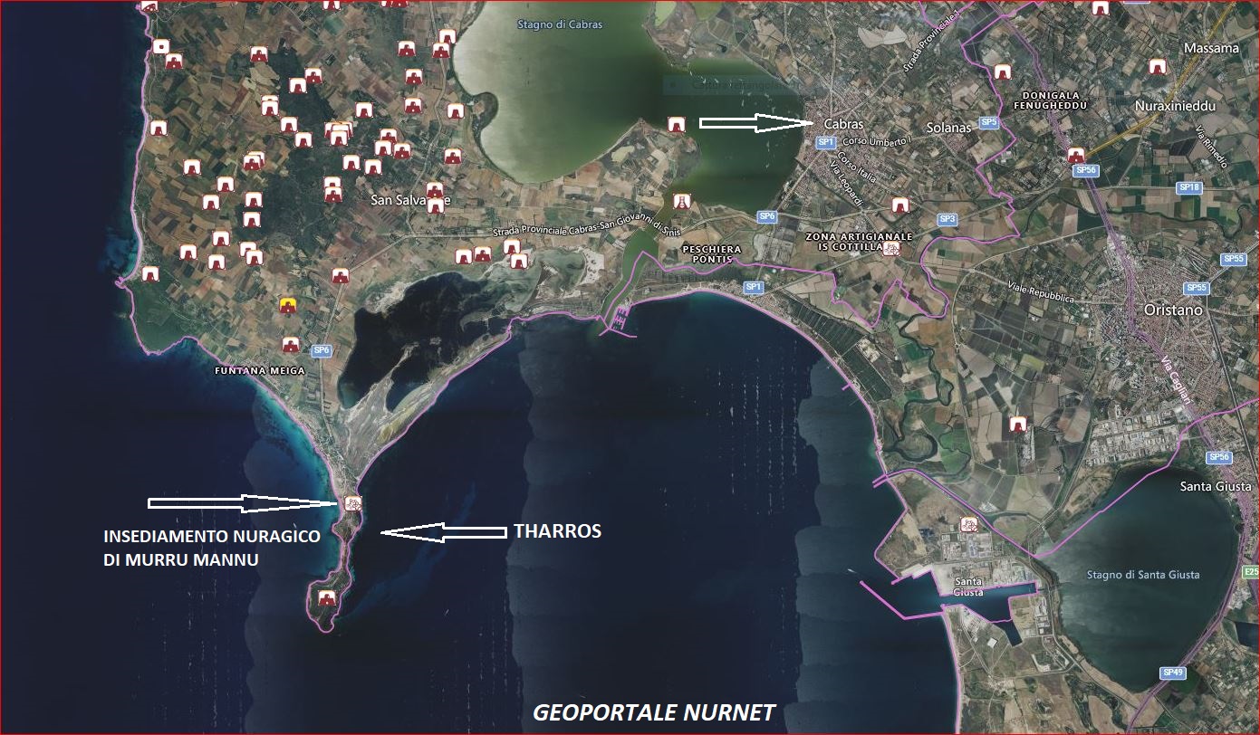 “La città di Tharros, ubicata all’estremità meridionale della Penisola del Sinis (Cabras), venne fondata alla fine dell’VIII sec. a.C. o nel VII da genti fenicie in un’area già frequentata in età nuragica. Su una delle tre colline su cui sorge la città, la più settentrionale, nota con il nome di Su Murru Mannu (in sardo “grande muso”), è visibile ancora oggi un importante villaggio protostorico (età del Bronzo medio-recente) che doveva essere già abbandonato al momento dell’arrivo dei Fenici (n. 7). I resti di un monumento nuragico sono stati riconosciuti alla base della torre spagnola del colle di S. Giovanni (n. 20); altri due nuraghi si trovano sul Capo S. Marco, uno, detto Baboe Cabitza, nella parte più alta del promontorio, l’altro presso l’insenatura di Sa Naedda. L’arrivo dei Fenici e la fondazione della città coincidono con un momento di straordinaria attività coloniale da parte dalle genti levantine in tutto il bacino occidentale del Mediterraneo […]”.